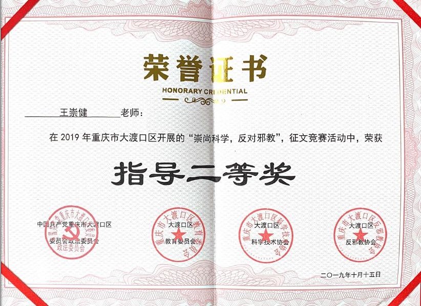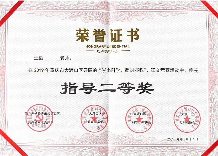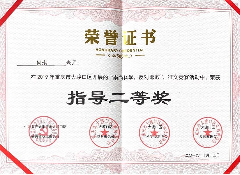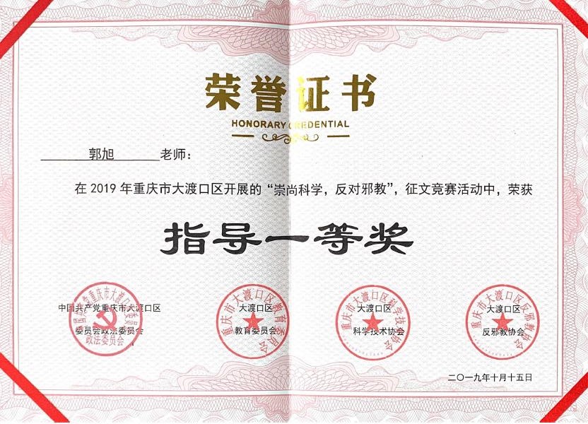 热烈祝贺郭旭、王崇健、何琪、王彪老师在2019年重庆市大渡口区开展的“崇尚科学、反对邪教”,征文竞赛中荣获指导一等奖、指导二等奖!