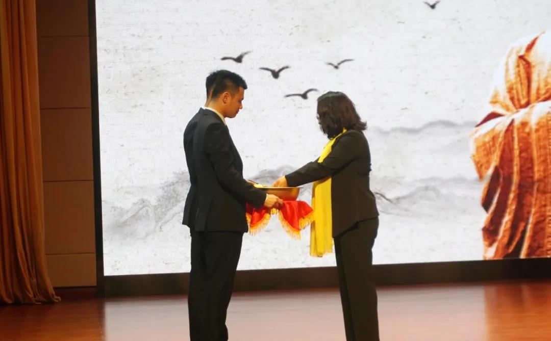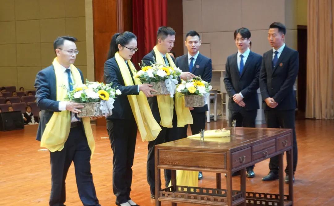 助祭初中部德育处苏功财主任、小学部德育处苏亚男主任、教师代表周满老师行献花之礼。